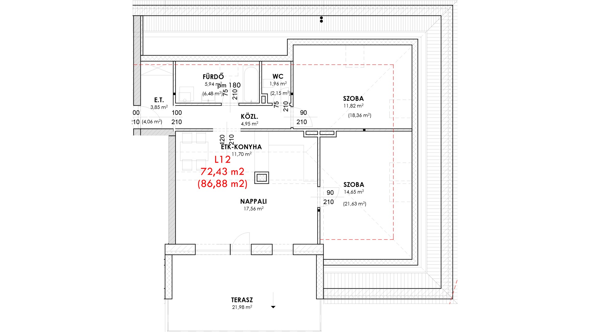 | Lakás L12 | Σ 72,43 m2 (86,88 m2) + 21,98 m2 terasz |