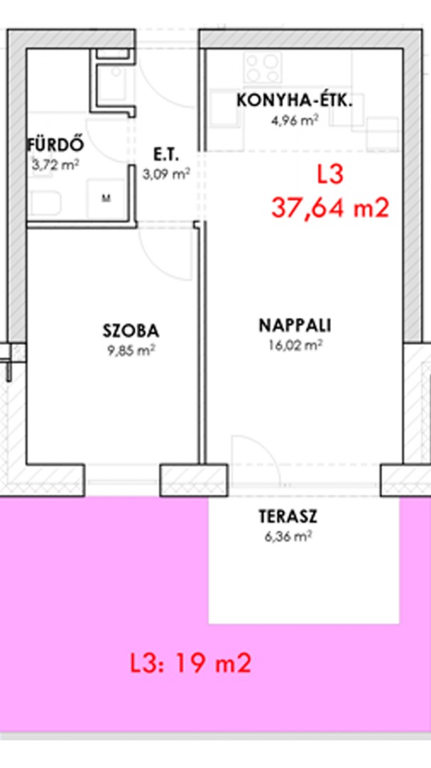 | Lakás L3 | Σ 37,64 m2 + 19 m2 kert + 6,36 m2 terasz |