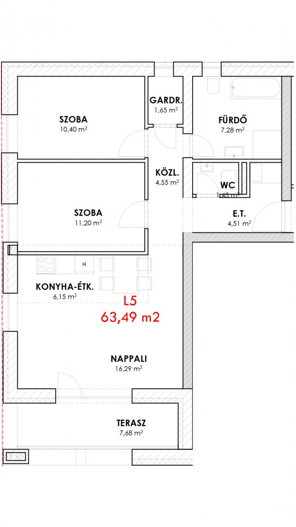 | Lakás L5 | Σ 63,49 m2 + 7,68 m2 terasz |