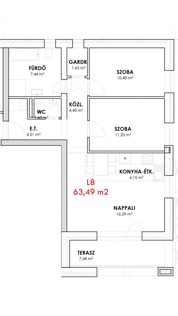 | Lakás L8 | Σ 63,49 m2 + 7,68 m2 terasz |