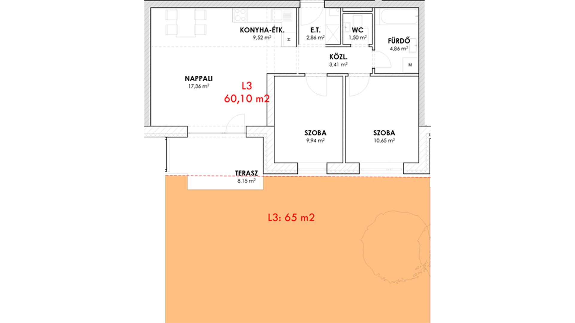 | Lakás L3 | Σ 60,10 m2 + 65 m2 kert + 8,15 m2 terasz |