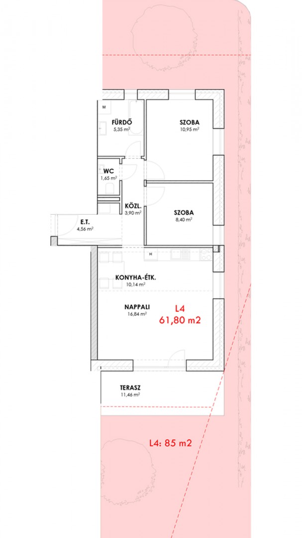 | Lakás L4 | Σ 61,80 m2 + 85 m2 kert + 11,46 m2 terasz |
