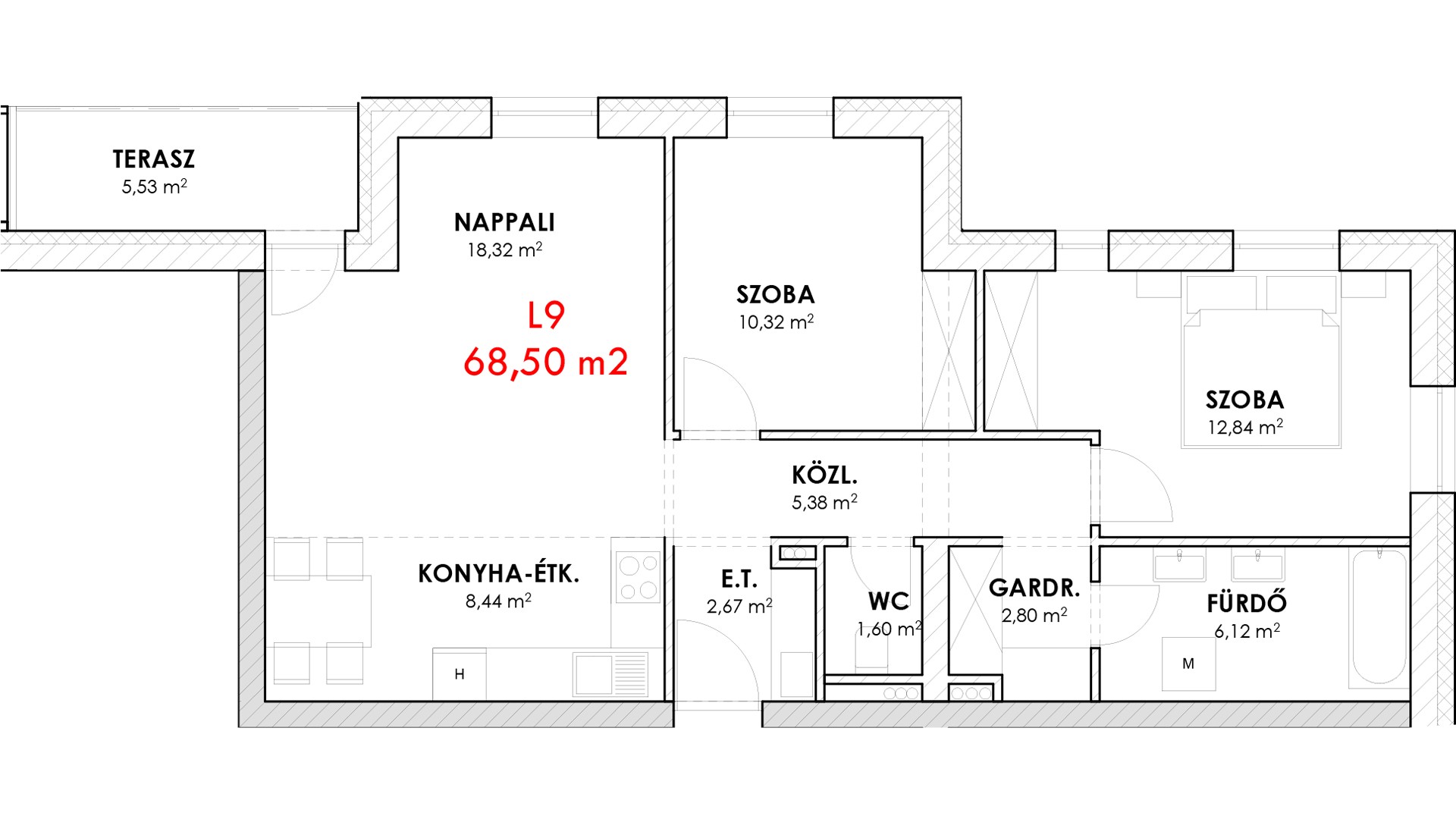 | Lakás L9 | Σ 68,50 m2 + 5,53 m2 terasz |